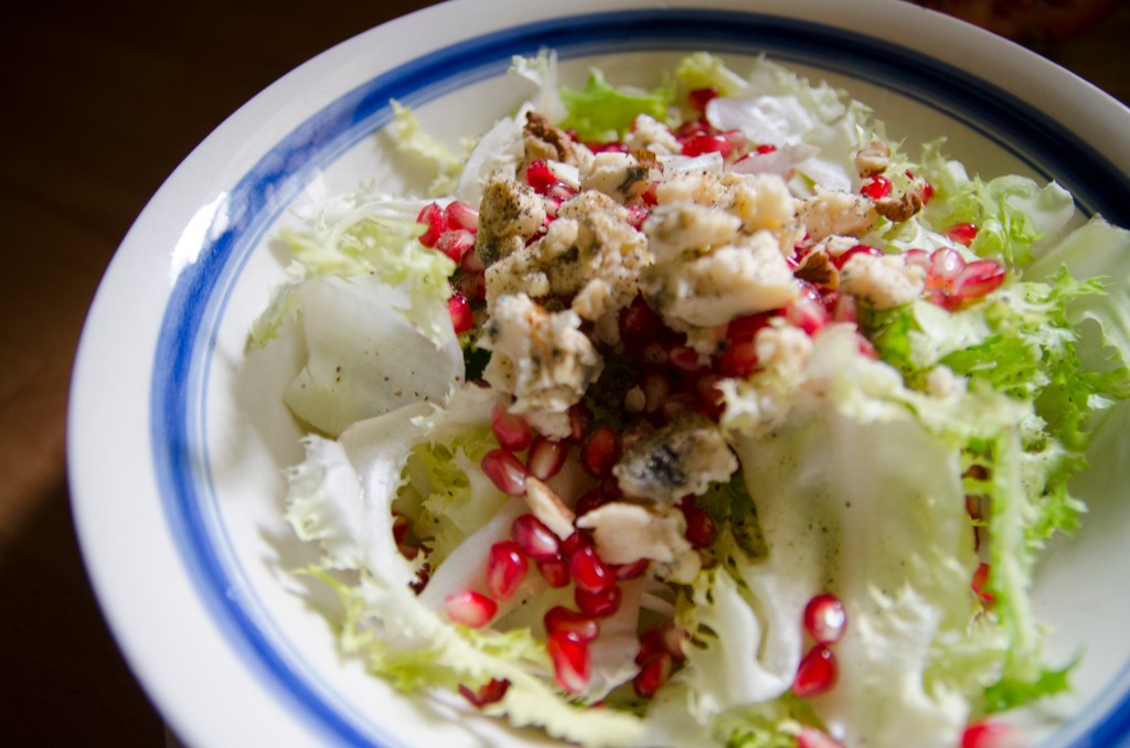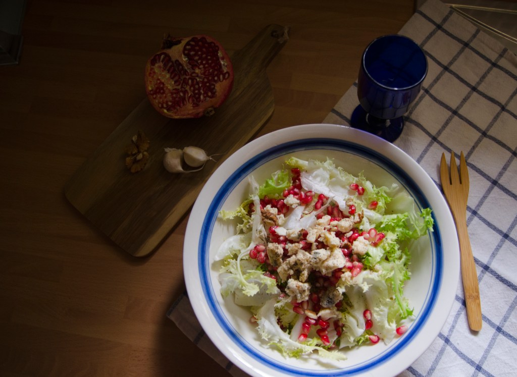 La ensalada de escarola es un clásico de mi casa en navidad, para acompañar con el cordero asado que solemos cenar, pero al mudarme a la península yo me la he apropiado para casi todos los días al salir del gimnasio, me encanta como en esta receta o también con pimientos rojos asados y atún. Además es fenomenal porque es un alimento compuesto prácticamente por agua y muy pocas calorías tiene vitamina C, B, K, ayuda a fortalecer el sistema inmunológico y es rica en calcio y potasio, esta receta en concreto como lleva ajo evita los resfriados y la granada tiene muchos antioxidantes, así que muy bien todo.