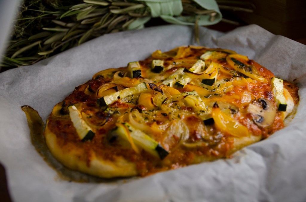 3.Mozzarella, salsa de tomate, calabacín, cebolla, pimiento y champiñones.