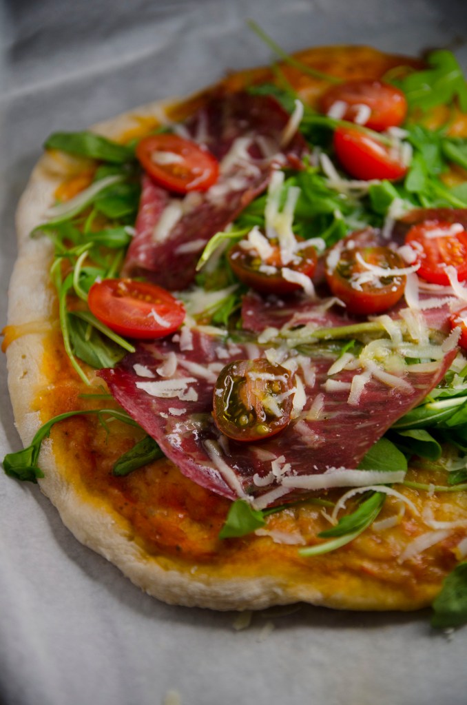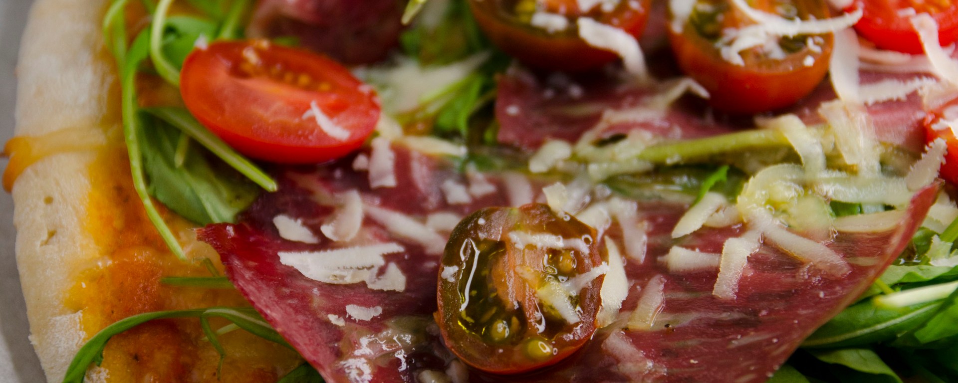 1.Mozzarella, salsa de tomate, rúcula, pastrami, tomates cherry y queso parmesano.