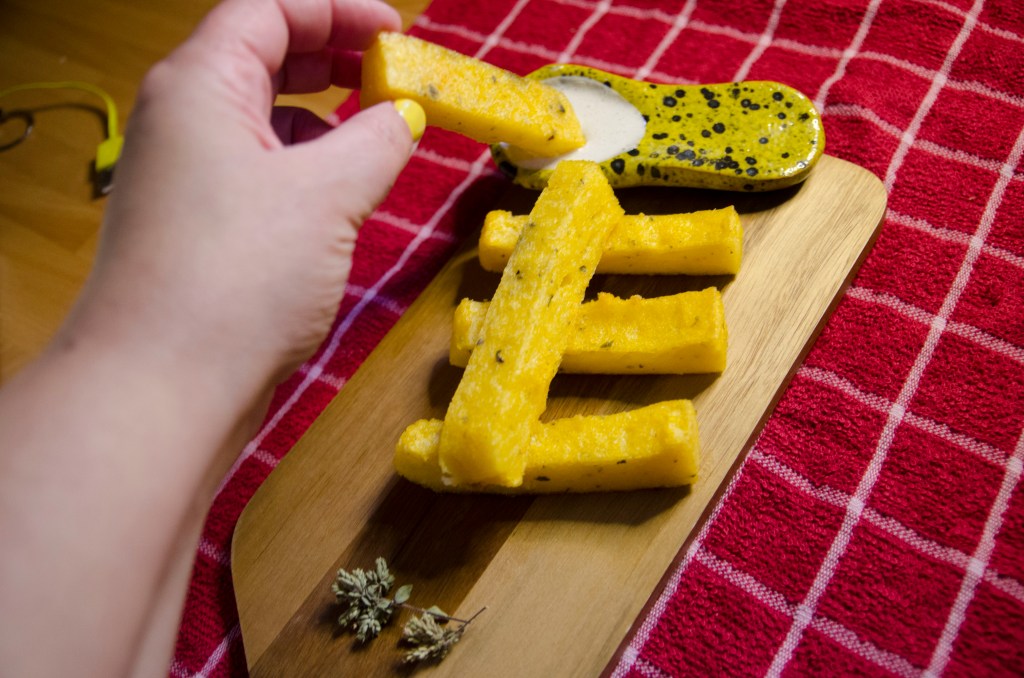 - Cuando el molde con la polenta ya no esté tan caliente, tápalo bien con papel de cocina transparente y déjalo en la nevera hasta que esté bien compacta. Luego desmolda y corta los palitos de polenta.