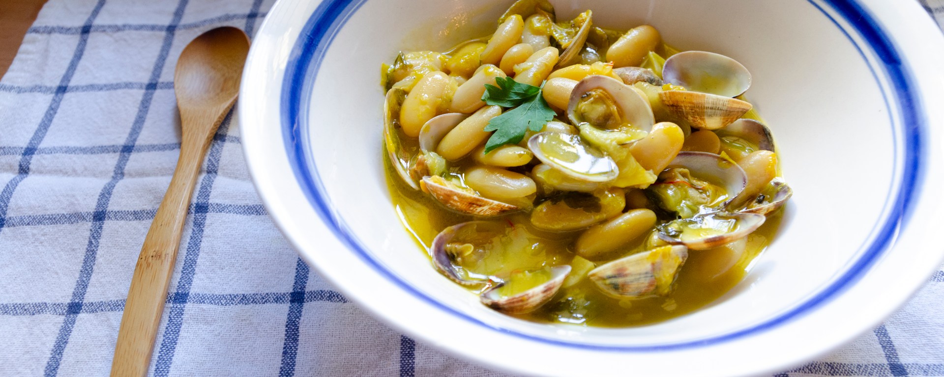 Pela y corta la media cebolla muy finita, también los dientes de ajo y el perejil. Ponlo todo en una sartén con un poquito de aceite de oliva a fuego medio, y hasta que esté doradito, añade la harina tamizada para que no se haga grupos mientras vas removiendo, después agrega el vino blanco poco a poco sin dejar de remover. Y ahora incorpora las fabes y el azafrán, cuando las almejas se vayan abriendo del todo, añadelo al cardelo con las fabes y tenlo una media hora más a fuego bajo para que se mezcle todo bien, pruebalo y ajustalo de sal. Déjalo reposar y a comer! Maridalo con un vino blanco y a mi no me hizo falta ni pan.