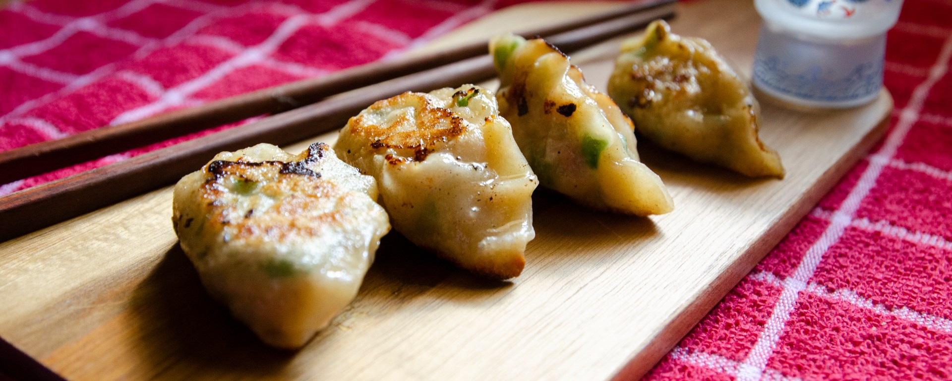Para cocinar calentamos una plancha o sartén y ponemos un poco de aceite sellamos la parte de abajo de la gyoza y después con la tapa de una sartén lo cubrimos para que haga efecto vapor y se cocine, se puede añadir un poco de agua también, vamos girándola y al final ponemos un chorrito de salsa de soja y listo.