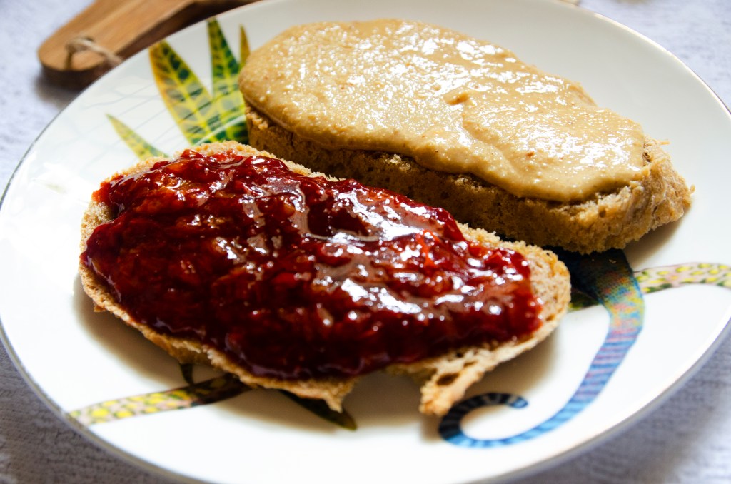 En cuanto a la mantequilla de cacahuete y la mermelada seguí la receta que encontré en el instagram de Teri Mari de @somoslasmorsas y quedo estupendamente.