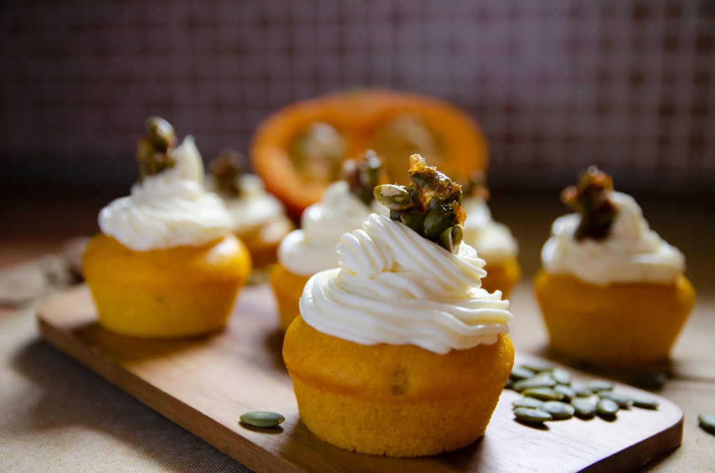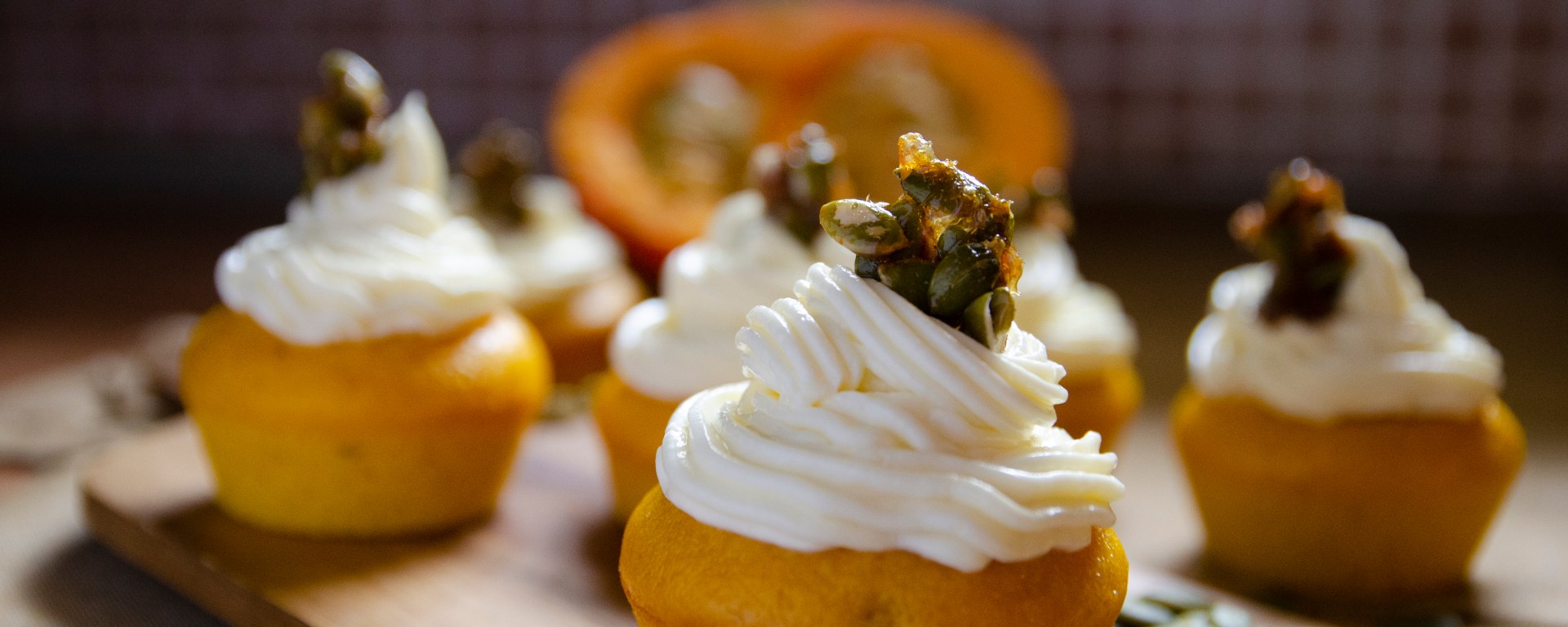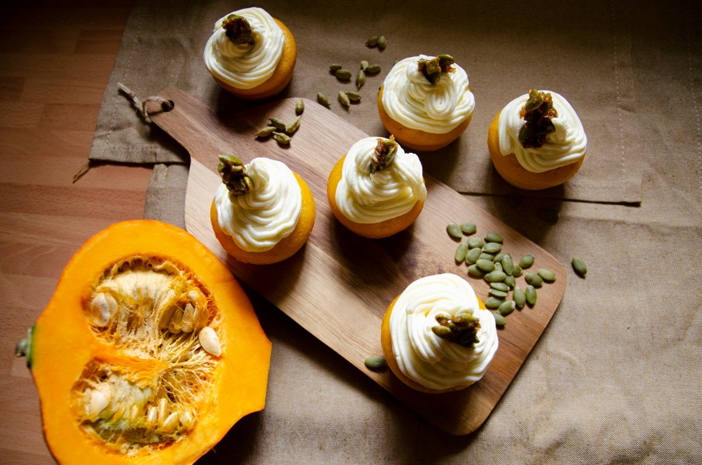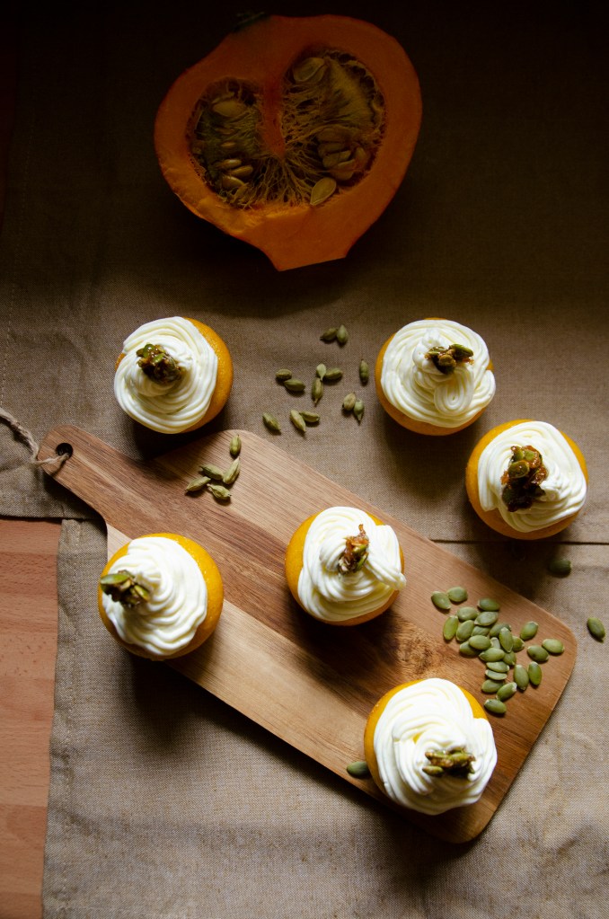 Mi buen vecino León me trajo del huerto donde trabaja “Vega del Tajuña” dos calabazas una se llama cacahuete y la otra potimarron. Las calabazas se definen como bayas de cáscara dura y ahora es su temporada, así que aprovechando que viene “Halloween” o el día de todos los muertos, les dejo esta receta de cupcakes de calabaza con cardamomo y cobertura de mascarpone o queso crema.