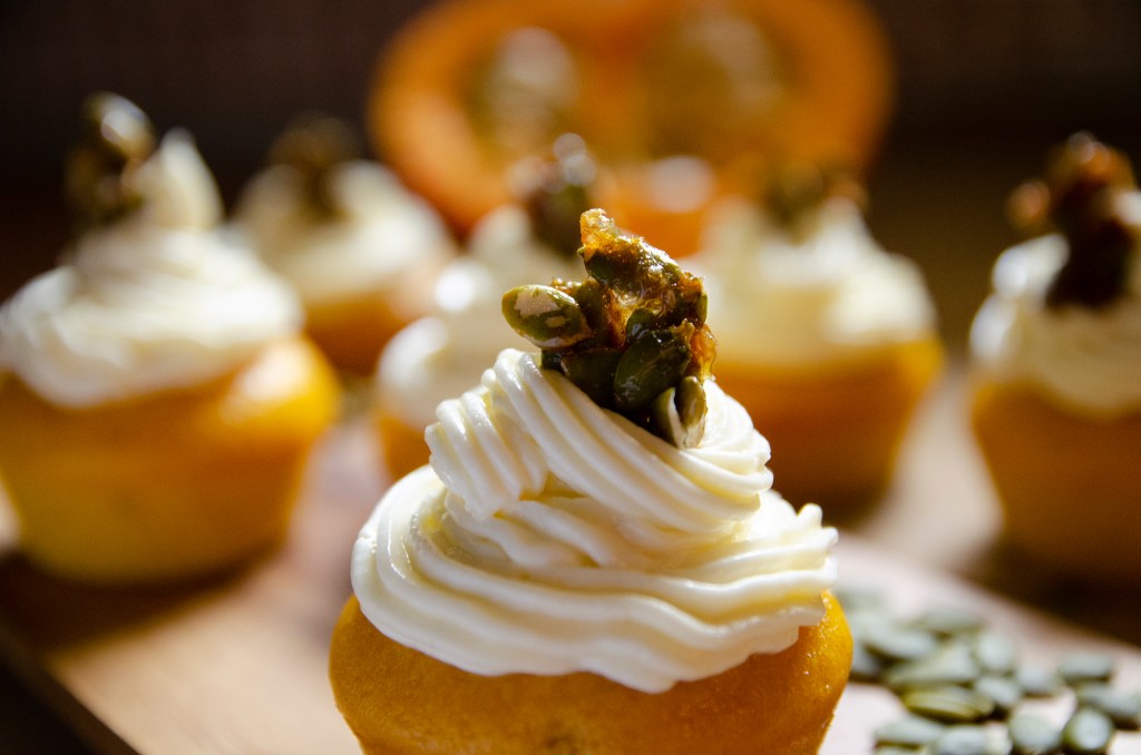 Desmoldamos los cupcakes y con la manga pastelera vamos adornarlo en círculos de fuera hacia dentro y ponemos un poco de las pipas de calabaza caramelizada encima para adornar ¡y listo!